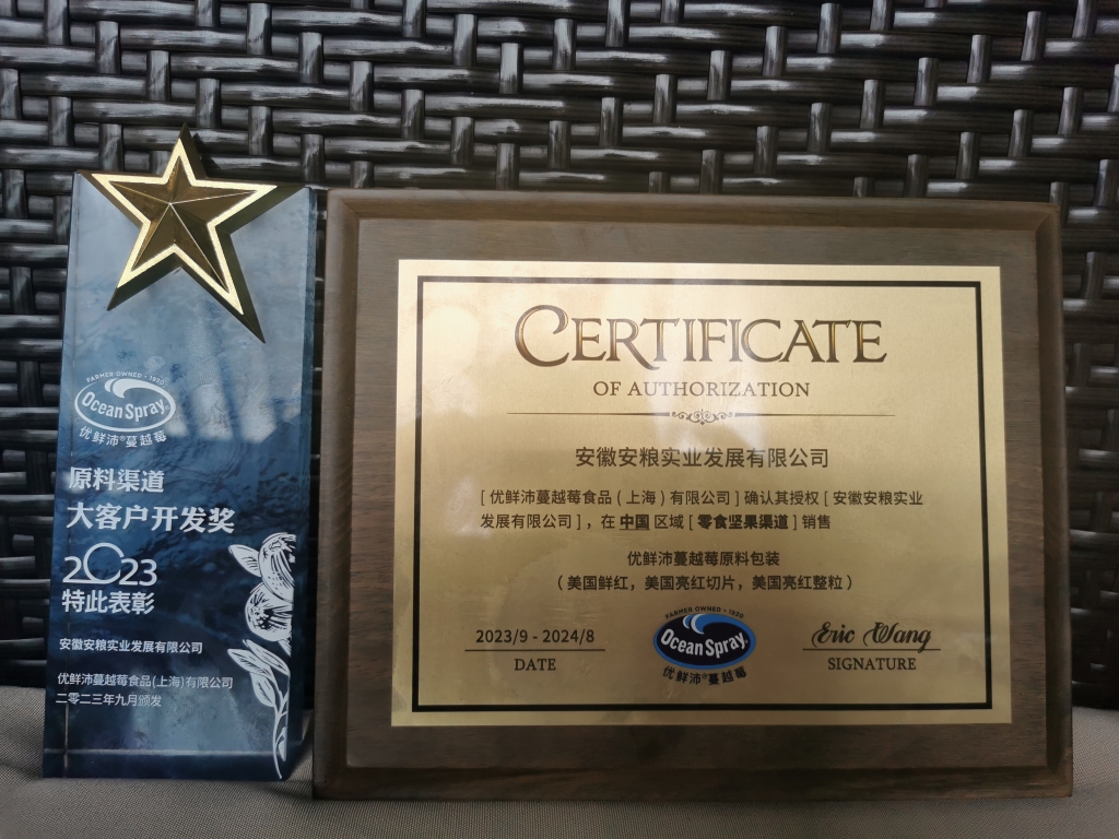 安糧實(shí)業(yè)獲得優(yōu)鮮沛品牌授權(quán),并榮獲“大客戶(hù)開(kāi)發(fā)獎(jiǎng)”,不僅是對(duì)安糧實(shí)業(yè)在休閑食品原料領(lǐng)域?qū)I(yè)性的認(rèn)可,也是對(duì)我司市場(chǎng)開(kāi)拓能力的信任。通過(guò)共享資源、互換優(yōu)勢(shì),安糧實(shí)業(yè)與優(yōu)鮮沛將共同推動(dòng)休閑食品行業(yè)的發(fā)展,為廣大消費(fèi)者帶來(lái)更多美味、健康的休閑食品,未來(lái)安糧實(shí)業(yè)與優(yōu)鮮沛的合作會(huì)讓更多客戶(hù)能采購(gòu)到高品質(zhì)休閑食品原料和新鮮蔓越莓產(chǎn)品。