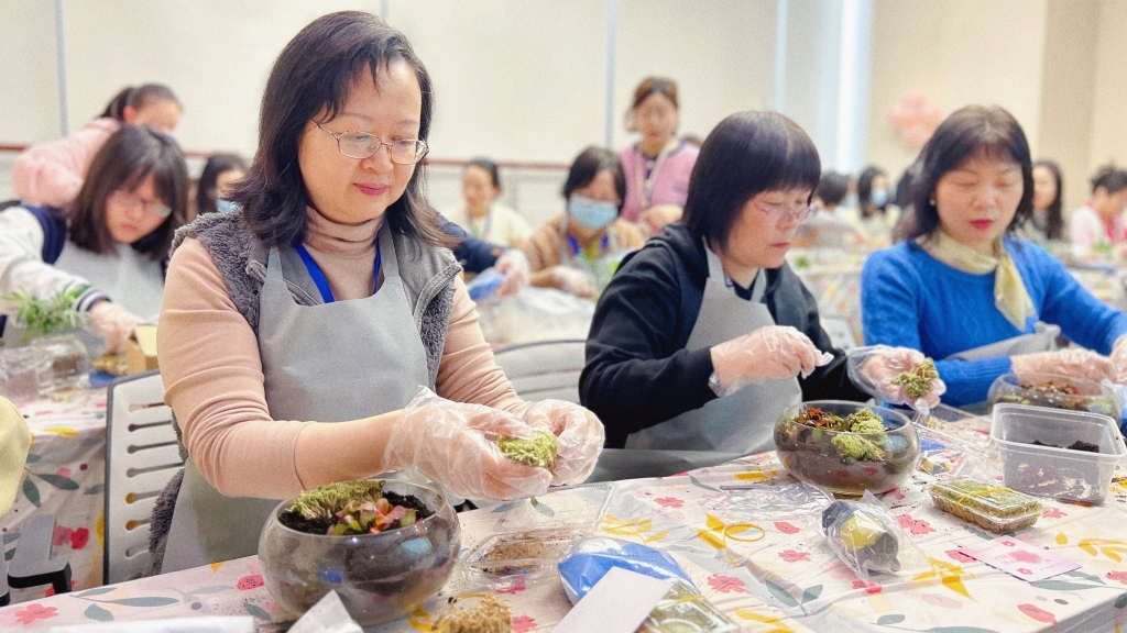 微景觀是將苔蘚、多肉等植物配以砂石、泥土、玩偶裝進(jìn)容器,構(gòu)成妙趣橫生的微觀世界,一個(gè)微景觀本質(zhì)上也是一個(gè)小型生態(tài)系統(tǒng)。女職工們在老師的指導(dǎo)下開始微景觀DIY活動,大家認(rèn)真構(gòu)思造型,充分發(fā)揮創(chuàng)造力,不一會兒,一份份清新雅致的微景觀作品便呈現(xiàn)在大家面前。在家中、辦公室的案頭擺上一盆,勞累疲乏時(shí)抬頭瞥見那一抹綠色,仿佛跌落到一個(gè)簡單純凈的童話世界。